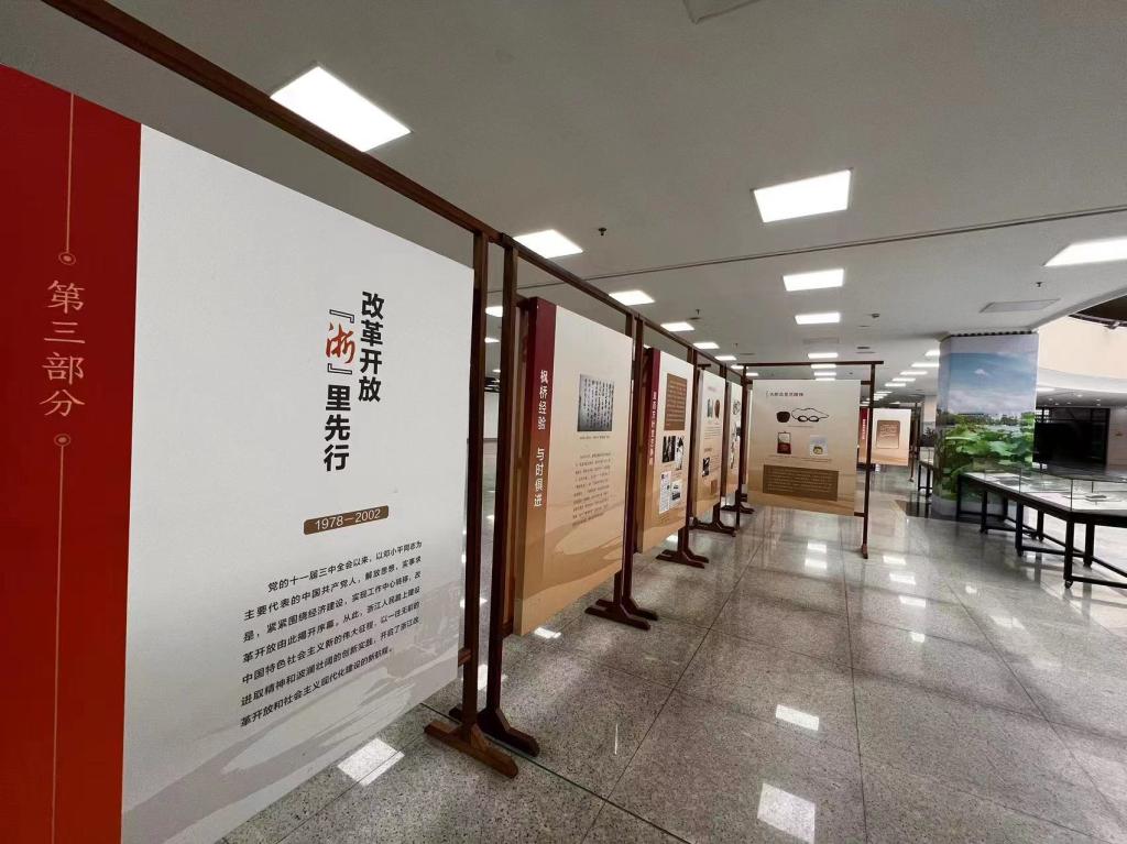 《紅船從“浙”里起航——“革命文物進(jìn)高校”大型巡展》以“革命文物”為載體,分為“革命火種在‘浙’里燃起(1921—1949)、新中國(guó)在‘浙’里見(jiàn)證(1949—1978)、改革開(kāi)放‘浙’里先行(1978—2002)、新征程‘浙’里譜寫(xiě)新篇章(2002年至今)”四個(gè)部分展示浙江百年革命征程。從1921年中國(guó)共產(chǎn)黨在嘉興南湖誕生,到“四千精神”開(kāi)啟浙江改革開(kāi)放之門,再到“八八戰(zhàn)略”“綠水青山就是金山銀山”等重要決策、重要思想論述的產(chǎn)生和發(fā)展過(guò)程。