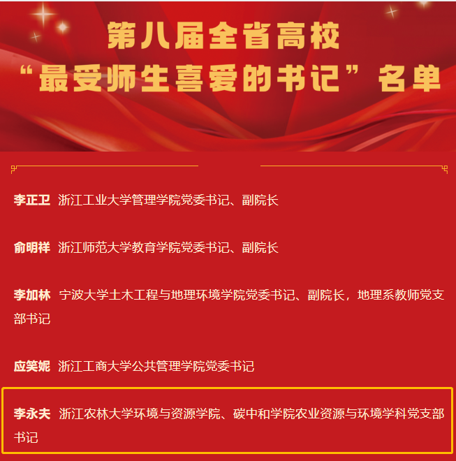 日前,浙江省普通高校黨建研究專業(yè)委員會(huì)、浙江教育報(bào)刊總社公布了第八屆全省高校“最受師生喜愛(ài)的書(shū)記”名單。我校環(huán)境與資源學(xué)院、碳中和學(xué)院農(nóng)業(yè)資源與環(huán)境學(xué)科黨支部書(shū)記李永夫同志入選,榮獲“最受師生喜愛(ài)的書(shū)記”稱號(hào)。
