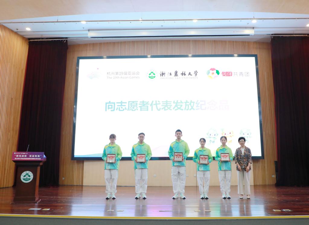 學校為“小青荷”志愿者準備了專屬紀念品——將亞運元素與學校元素相結(jié)合,用省非物質(zhì)文化遺產(chǎn)非遺剪紙制作而成的浙農(nóng)林大版的“小青盒”。施美紅向志愿者代表發(fā)放紀念品。