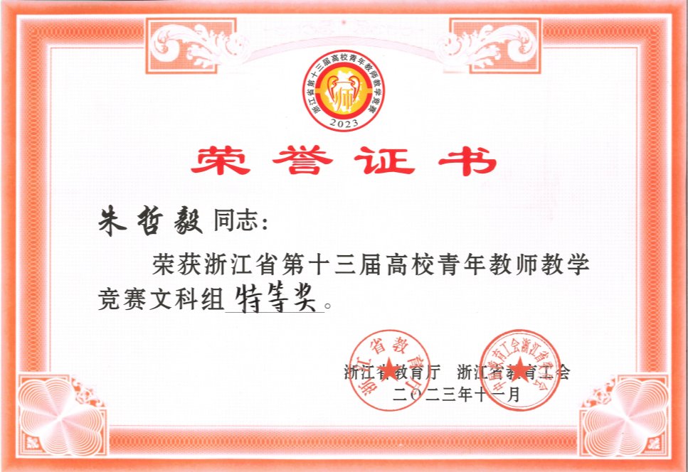 11月3日至5日,浙江省第十三屆高校青年教師教學競賽舉行,來自全省65所高校的137名青年教師參加決賽。我校經濟管理學院教師朱哲毅榮獲文科組特等獎。
