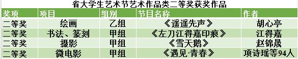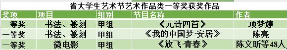 在榮獲一等獎的6件作品中,袁寬城演奏的二胡獨奏《查爾達什舞曲》、湯俊演唱的越劇《何文秀·桑園訪妻》、劉茂宇等4位同學表演的朗誦《駝峰之魂》獲得藝術表演類一等獎;項夢婷的書法篆刻作品《元詩四首》、陳亮的書法篆刻作品《我的中國夢·安居》以及陳文昕等48人共同創作的微電影《放飛·青春》獲得藝術作品類一等獎。