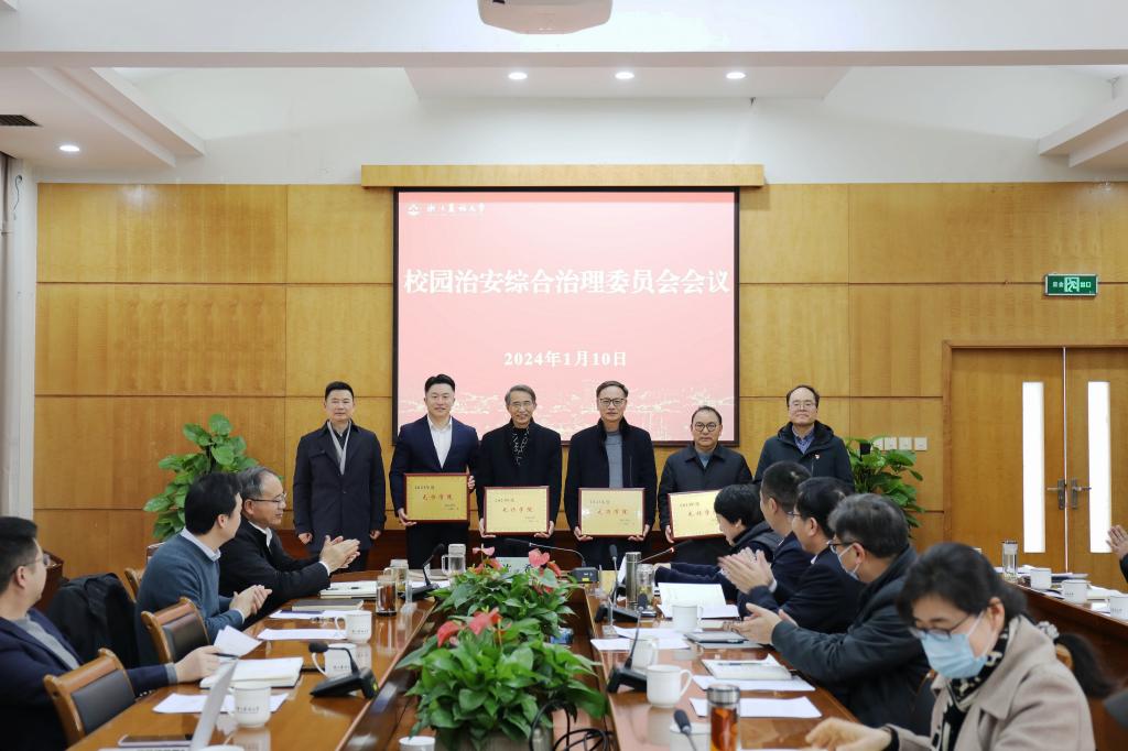 1月10日,學校召開校園治安綜合治理工作會議。校長沈希、副校長胡祖吉、徐愛俊出席會議,全體綜治委成員參加會議。會議由校黨委副書記施美紅主持。
