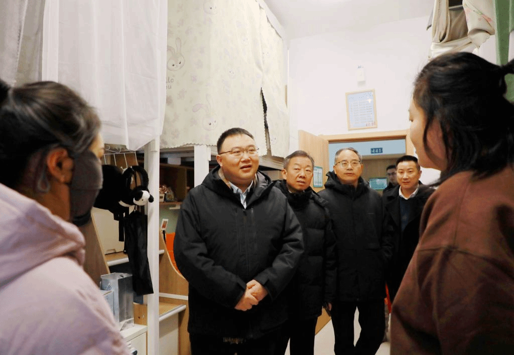 在學生宿舍,朱斌一行與留校學生親切交流,悉心詢問學生的假期安排、學習生活等情況,勉勵同學們要繼續保持學習的熱情,合理規劃假期,充實自己,同時要保持與家人的密切聯系,遇到困難及時聯系學校、老師。同時,他要求相關部門做好留校學生的安全、生活保障工作,確保讓同學們在學校度過一個平安、喜樂、祥和的春節。