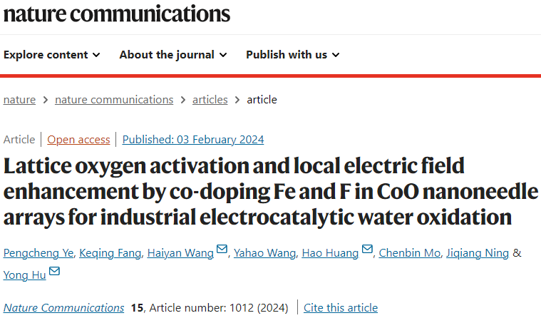 2月3日,化材學(xué)院胡勇教授等人在國際權(quán)威期刊《Nature Communications》(中科院1區(qū)Top,IF=16.6)在線發(fā)表題為“Lattice oxygen activation and local electric field enhancement by co-doping Fe and F in CoO nanoneedle arrays for industrial electrocatalytic water oxidation”(Fe和F共摻雜CoO納米針陣列增強(qiáng)晶格氧活化和局部電場促進(jìn)電催化析氧反應(yīng))的研究論文,證明了通過陰、陽離子雙摻雜策略可耦合晶格氧活化機(jī)制和局域電場,從而實(shí)現(xiàn)工業(yè)級電催化析氧反應(yīng)。