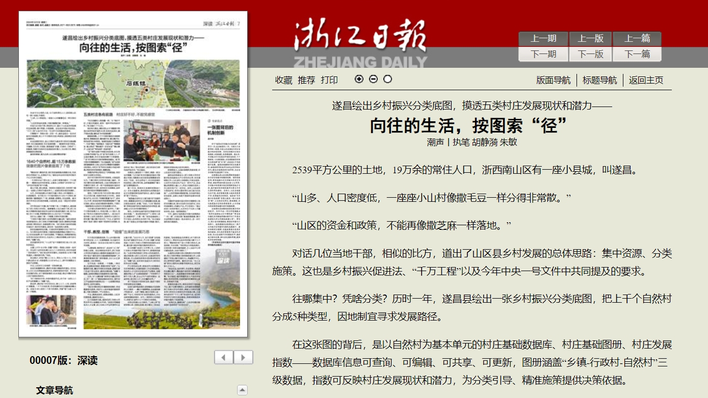 3月5日,《浙江日報》整版刊登《遂昌繪出鄉村振興分類底圖,摸透五類村莊發展現狀和潛力——向往的生活,按圖索“徑”》一文,報道了在浙江農林大學技術支持下,經過近一年努力,遂昌縣繪制形成了包括“一庫一冊一圖一指數”的鄉村振興分類底圖,為鄉村分類引導、精準施策,加速實現鄉村振興宏偉藍圖找準有力基點。