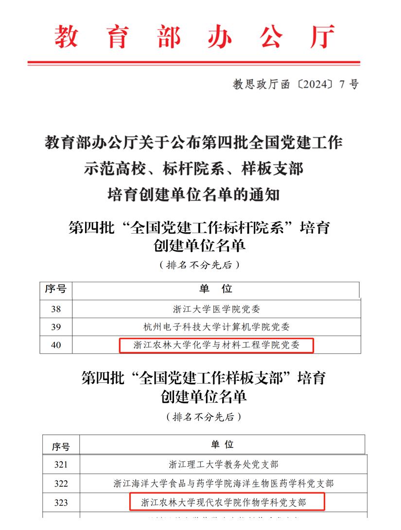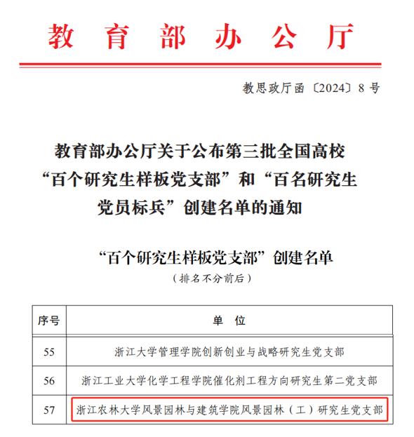 本次共評(píng)選產(chǎn)生全國(guó)黨建工作標(biāo)桿院系培育創(chuàng)建單位100個(gè),全國(guó)高校“百個(gè)研究生樣板黨支部”創(chuàng)建單位100個(gè),全國(guó)黨建工作樣板支部培育創(chuàng)建單位1001個(gè)。其中,我校化學(xué)與材料工程學(xué)院黨委入選全國(guó)黨建工作“標(biāo)桿院系”培育創(chuàng)建單位,現(xiàn)代農(nóng)學(xué)院作物學(xué)科黨支部入選全國(guó)黨建工作“樣板支部”培育創(chuàng)建單位,風(fēng)景園林與建筑學(xué)院風(fēng)景園林(工)研究生黨支部入選全國(guó)高校“百個(gè)研究生樣板黨支部”培育創(chuàng)建單位。