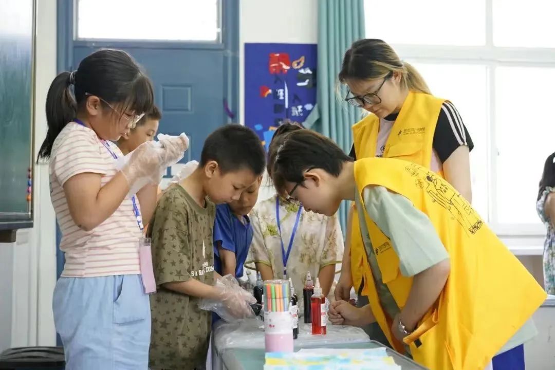 在杭州市臨安區,藝術設計學院“藝術+”彩虹課堂暑期實踐團隊的成員們走進湍口鎮小學,播種著藝術的種子。彩虹課堂由古貫今,著眼未來,從非遺扎染到古韻圖騰,從布藝手工到嘹亮紅歌,從粘土餐盤到數字博物館,浙農林大學子引領孩子們熱愛優秀傳統文化,樹立保護生態、面向未來的意識,從多個角度感受美、發現美、創造美,讓孩子們在輕松愉快的氛圍中體驗藝術的魅力。孩子們既學習到了紅色知識,又加深了愛國熱情,實現了美育和思政教育的完美融合,提升了鄉村兒童美育育人的實效。