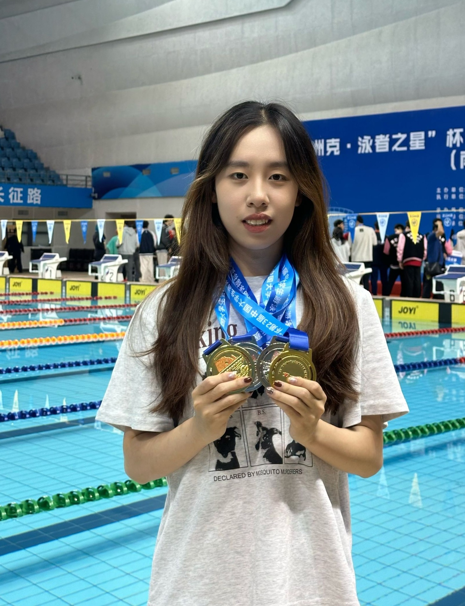 為者常成,行者常至。在2024年第23屆中國大學生游泳錦標賽(南方賽區)中,林千淇拿到了4*100米混合泳接力、女子4*50米混合泳接力雙金以及200m蝶泳銀牌。同時她也在大膽嘗試,跳出了自己蝶泳主項的舒適圈,挑戰了200m混合泳并且拿到了銀牌。正是那一個個在泳池里奮勇拼搏的日子,讓她一步步站上了更大的領獎臺,堅持和熱愛也成就了她胸前一塊塊閃閃發光的獎牌。