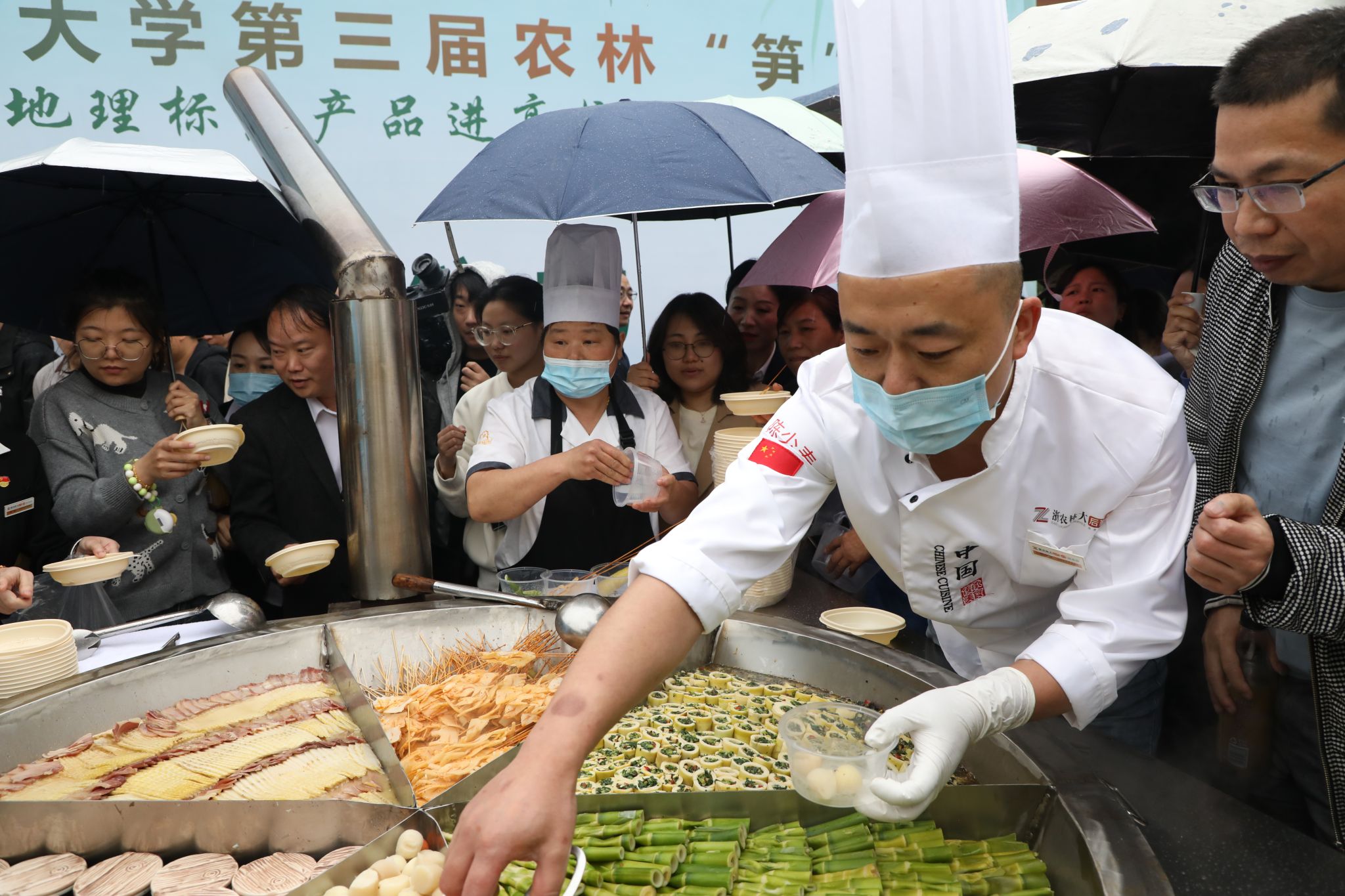 本屆農林“筍”宴系列活動分為筍香盈袖來、竹韻流芳遠、巧手烹春味、竹林嬉春趣四大主題,共11項特色活動輪番上演。在竹筍宴品嘗區,12道菜肴以“青竹承脈·地標領鮮”為主題,以“地標十二鮮”為名,由后勤中心和區市場監管局聯合推出,體現一年十二個不同風味的當季筍類及全國地理標志產品菜肴。種類繁多的美食讓人目不暇接,引得近千名師生爭相品嘗,領略中華美食背后豐富的竹文化底蘊和匠心精神。