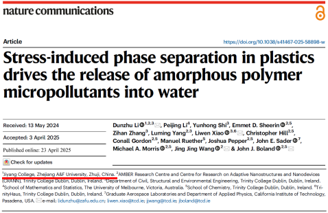 4月23日,暨陽學院李敦柱教授團隊在《Nature》子刊《Nature Communications》(中科院1區Top,IF-5yr=16.1)在線發表題為《應力誘導塑料相分離行為及其驅動塑料基微污染物釋放行為研究》(Stress-induced phase separation in plastics drives the release of amorphous polymer micropollutants into water)的研究性論文,從分子尺度首次揭示了塑料基材內源性殘余應力對塑料降解和微污染物釋放的關鍵性作用機制,有望為高效控制塑料污染提供理論支撐。