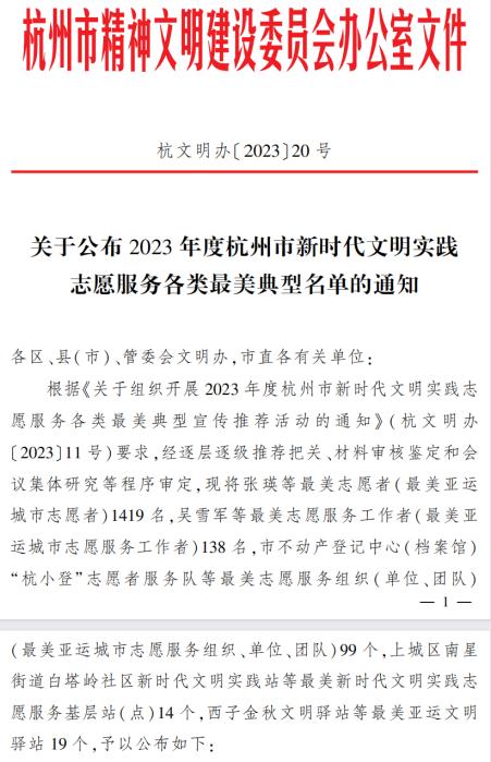 據(jù)悉,本次評(píng)選經(jīng)逐層逐級(jí)推薦把關(guān)、材料審核鑒定和會(huì)議集體研究等程序?qū)彾?,“服?wù)總隊(duì)”經(jīng)由臨安區(qū)委宣傳部、區(qū)文明辦推薦至杭州市文明辦,全市共評(píng)選最美志愿服務(wù)組織(單位、團(tuán)隊(duì))(最美亞運(yùn)城市志愿服務(wù)組織、單位、團(tuán)隊(duì))99 個(gè),最美志愿者1419名。