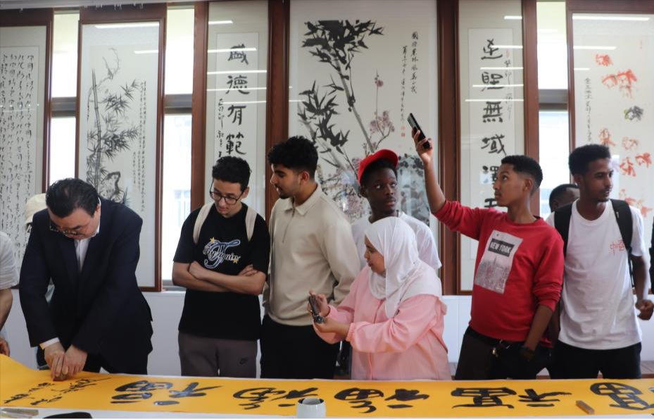 交流會后,藝術家為留學生們講授了中國書法技法,并現場揮毫創作,展示了中國書法的獨特魅力。在場的留學生驚嘆于藝術家們的精湛技藝,紛紛拿起手機拍照,深深陶醉在硬筆書法的藝術世界之中。