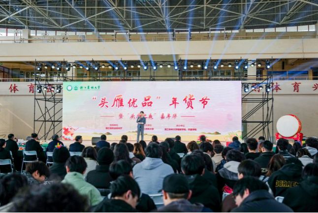 12月27日-28日,2024“頭雁優品”年貨節暨 “頭雁之夜”嘉年華活動在我校東湖校區體育館舉行。來自新疆、浙江、江西等地的128家“頭雁”企業和“農創客”們帶來了500余種特色農副產品,并同時推出系列由我校教師團隊自主研發的科技成果。