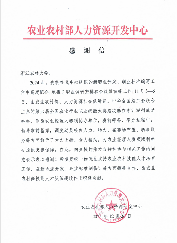 近日,農業(yè)農村部人力資源開發(fā)中心給我校發(fā)來感謝信,對我校在第六屆全國農業(yè)行業(yè)職業(yè)技能大賽中開展的工作和支持幫助表示感謝。