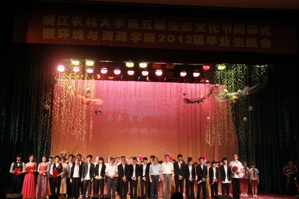 浙農林大新聞網訊 6月3號晚,校第五屆生態文化節閉幕式暨環境與資源學院2012屆畢業晚會在東湖校區活動中心影劇院正式拉開帷幕。校黨委學工部部長張敏生,環資學院執行院長姜培坤、黨總支書記韋新良,以及宣傳部、建設處、校團委、各二級學院相關負責人共同出席本次晚會,與我院師生公話生態,共享暖暖畢業情。