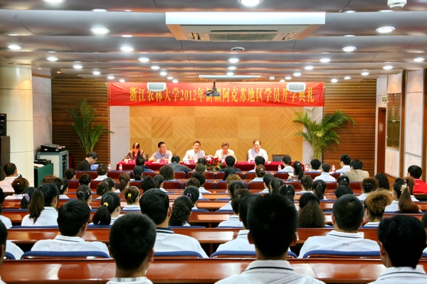 浙農(nóng)林大新聞網(wǎng)訊 4月27日上午,我校2012年新疆阿克蘇地區(qū)學(xué)員開學(xué)典禮在活動中心舉行。校黨委副書記余杰、副校長王自勇,新疆阿克蘇地區(qū)普通高校畢業(yè)生赴浙江省培養(yǎng)工作副總領(lǐng)隊王星、赴我校領(lǐng)隊張平出席開學(xué)典禮。學(xué)校相關(guān)職能部門和學(xué)院(部)負責(zé)人,新疆阿克蘇地區(qū)來校學(xué)習(xí)的學(xué)員、帶隊輔導(dǎo)員等百余人參加了典禮。典禮由學(xué)工部部長張敏生主持。