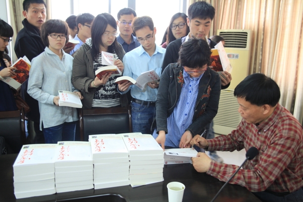 座談會上,同學們踴躍發言,積極提問,氣氛活躍,每個人都受到了深刻的教育。為進一步推進大學生學雷鋒常態化,文化學院特地購買了60本長篇小說《雷鋒》贈送給同學們,黃亞洲老師為每位同學在小說上簽名留念。
