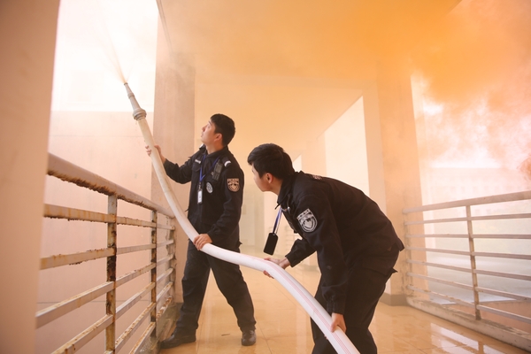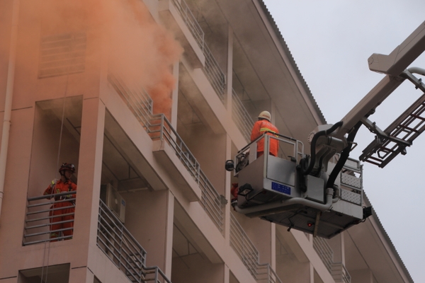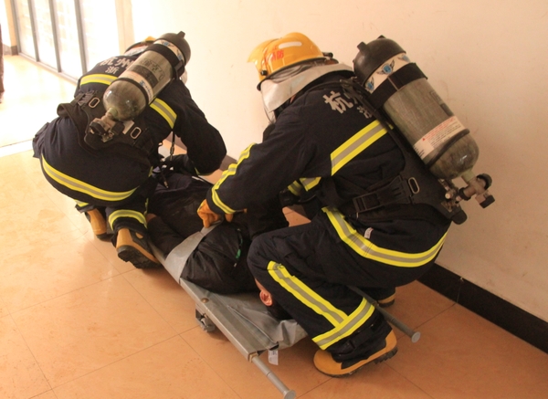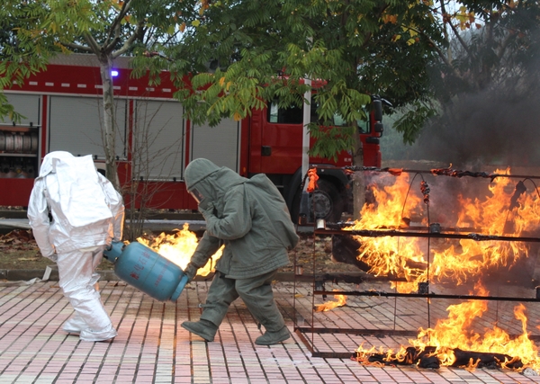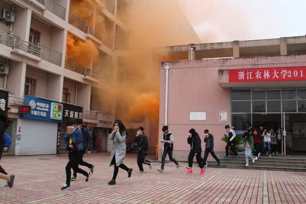 現場模擬學生宿舍發生火災,公寓值班員立即撥打“校園110”報警電話,指揮中心立即啟動浙江農林大學應急預案,迅速調集校志愿消防隊員趕赴“火災現場”開展滅火、疏散。被困學生在樓宇疏散引導員的指導下用濕毛巾捂住口、鼻,彎著腰,沿墻角、樓梯有序撤離。