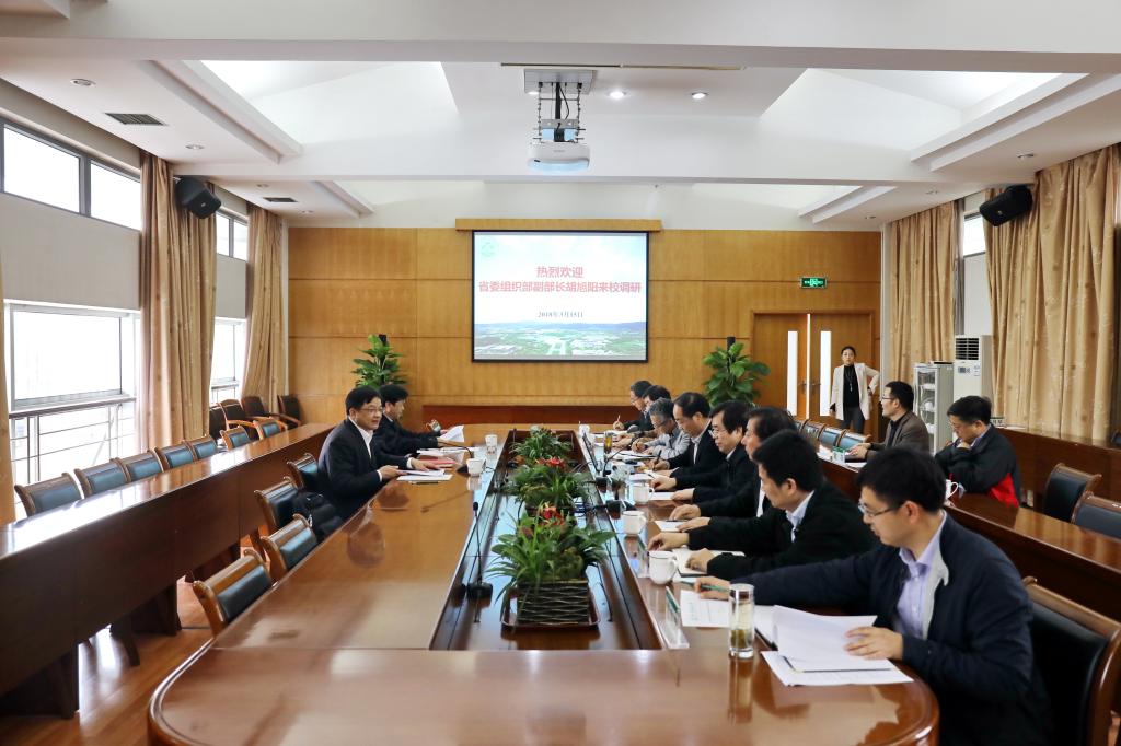 3月15日,省委組織部副部長胡旭陽在省委組織部干部三處副處長鄧富國陪同下來校調(diào)研。校黨政班子成員參加調(diào)研座談。