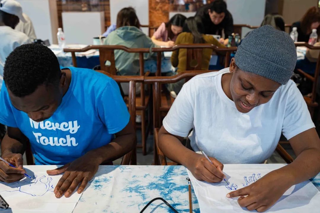 聽完講解后,留學(xué)生們很快掌握了扎染的基本方法和步驟,大家拿起工具,在白布上仔細(xì)繪制出精美的春牛圖案。