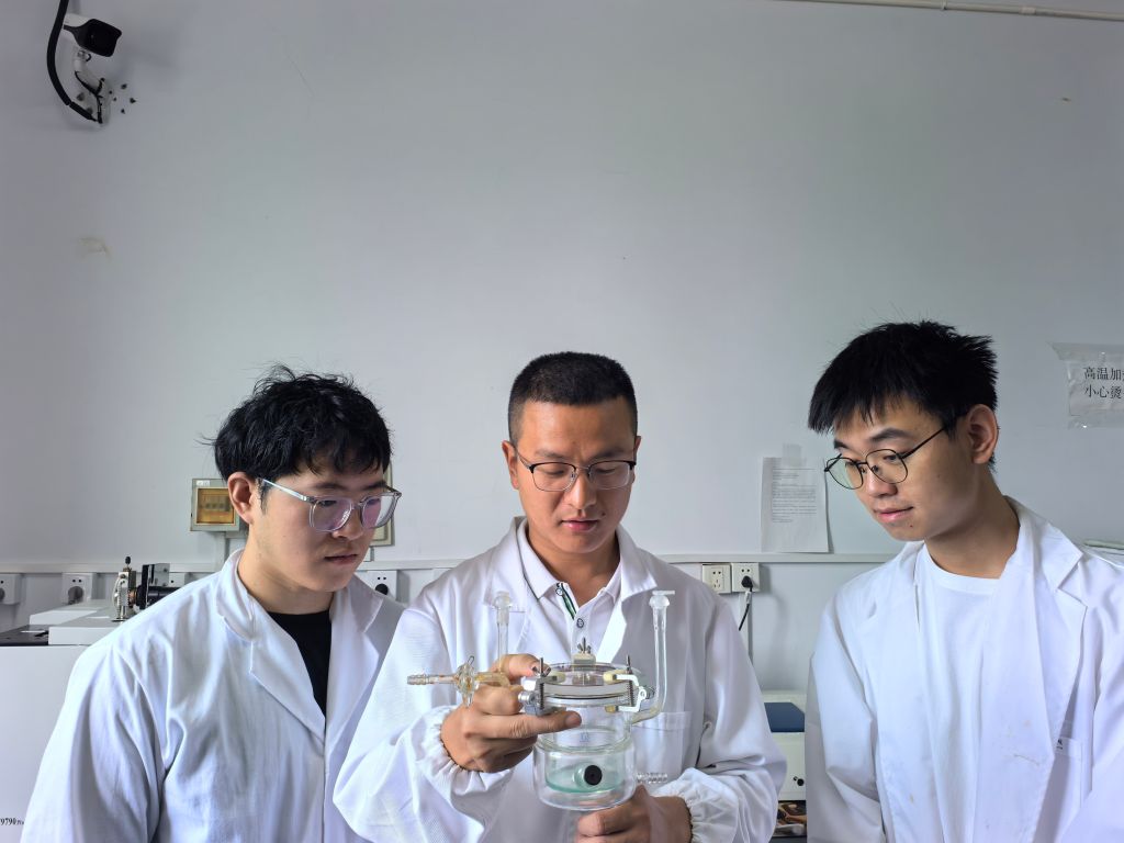 李華豐(圖中左二)在實驗室里指導學生開展科研。學校供圖