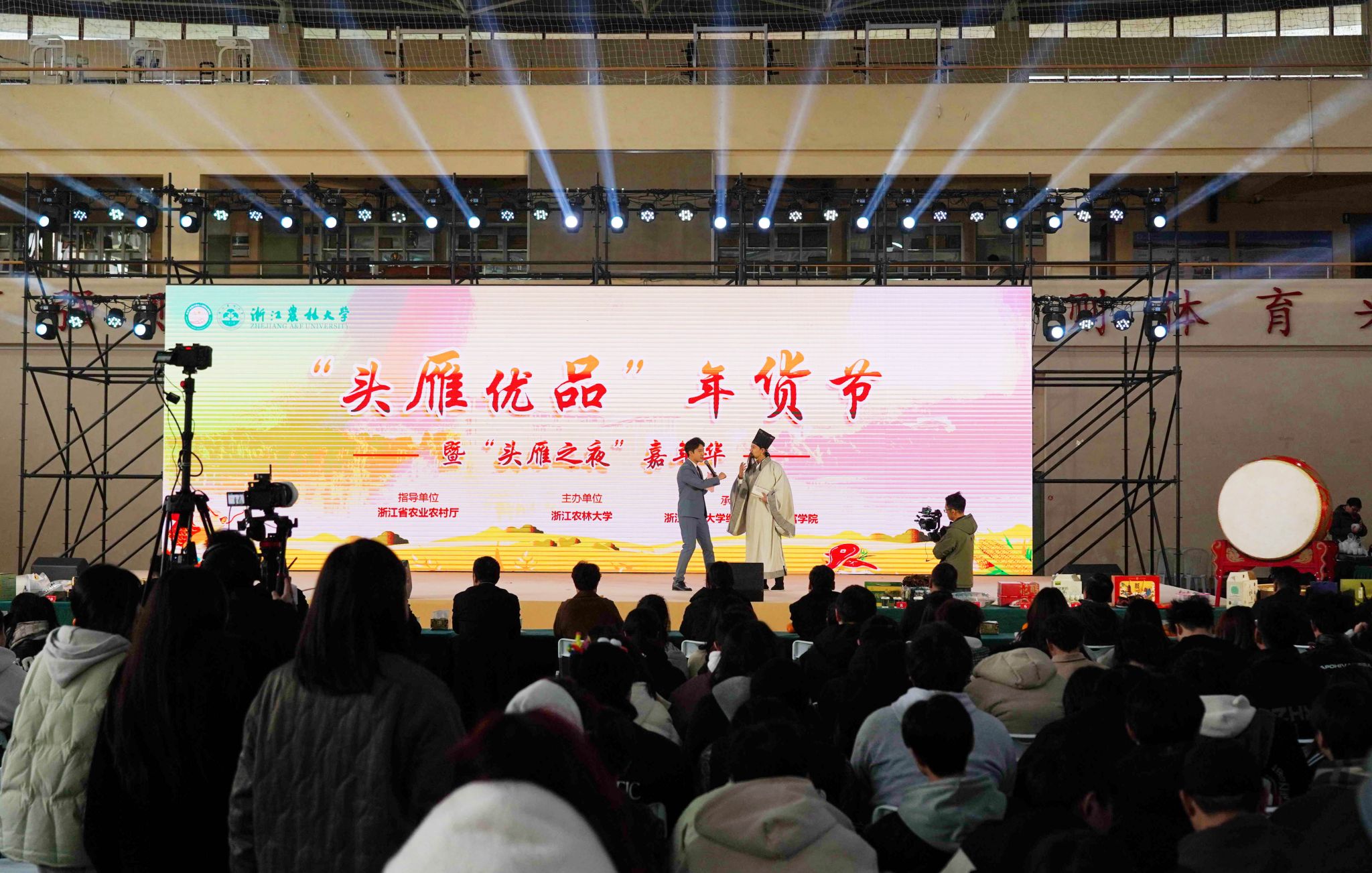 上午11時,在一場隆重的開集儀式后,為期兩天的浙江農林大學“頭雁優品”年貨節拉開帷幕。開幕式上,由主持人扮演的穿越時空的“蘇東坡”,帶來精彩的“頭雁興農夢”舞臺劇,用古今結合的方式生動展現了鄉村蝶變的壯麗畫卷。舞臺下,年貨節正式開啟,現場人頭攢動,各類互動活動精彩紛呈,現場品嘗、體驗制作、選購打包,線上各大網絡平臺和直播間也同步直播售賣,數千師生、市民共同參與到這場年貨盛宴中。