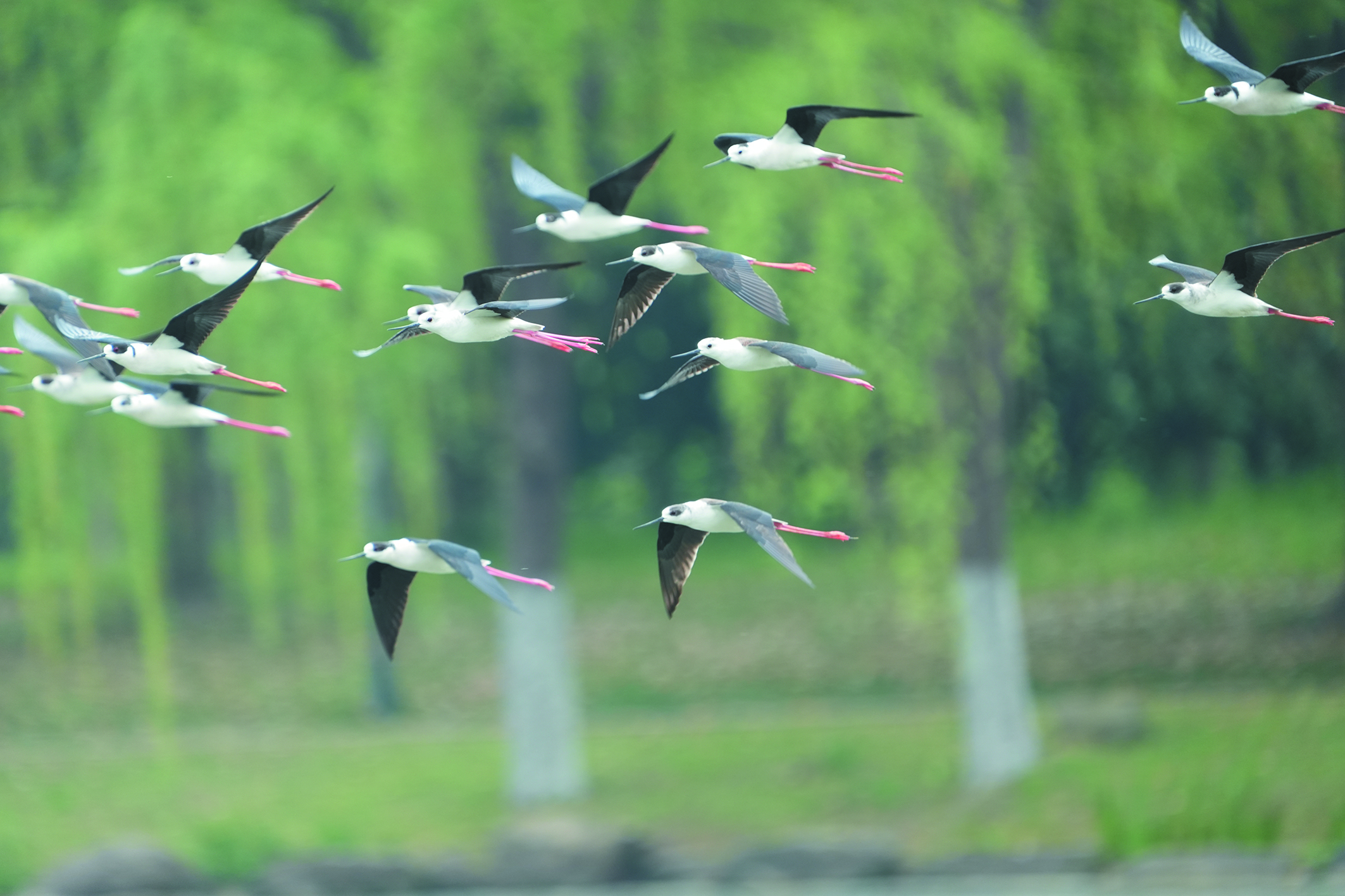 觀鳥愛好者葉喜陽老師是當天的記錄者之一。他回憶道,9日上午接到學生提供的線索后,便攜帶專業(yè)設(shè)備趕赴東湖。在他的鏡頭下,20余只黑翅長腳鷸在淺水灘處結(jié)群覓食,時而繞湖低飛,其標志性的黑色羽翼與紅色長腿在碧波映襯下尤為醒目。“這類對水質(zhì)極其敏感的候鳥,實則是生態(tài)環(huán)境的‘質(zhì)檢員’?!睆娜~喜陽介紹,這類被稱作“濕地超模”的候鳥每年春季需完成從南方越冬地到北方繁殖地的數(shù)千公里遷徙。作為典型濕地指示物種,它們只選擇開闊湖泊、淺灘與沼澤作為停棲地,而浙江農(nóng)林大學東湖濕地已連續(xù)兩年成為其遷徙途中的“五星級驛站”。