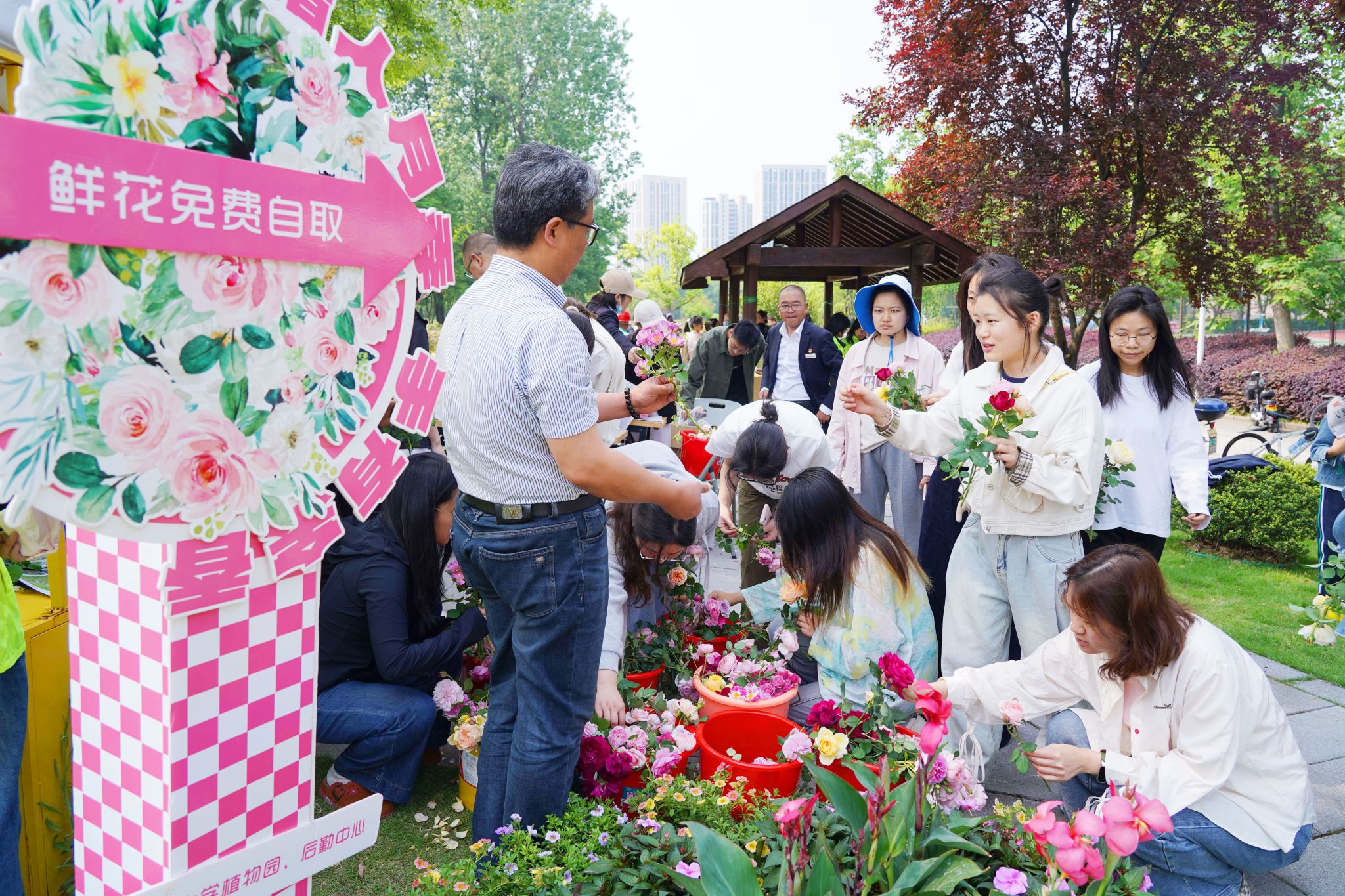 4月29日,在浙江農(nóng)林大學(xué)東湖校區(qū)的月季園里,該校后勤人員將修剪下的數(shù)千枝各色月季花免費贈給廣大師生和市民,送上美好的祝福。