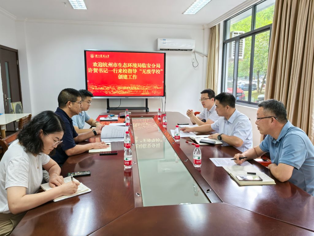8月27日,杭州市生態環境局臨安分局黨組書記、局長許賀一行來校指導“無廢學校”創建工作,公管處處長陳培金及相關負責人和工作人員參加座談。