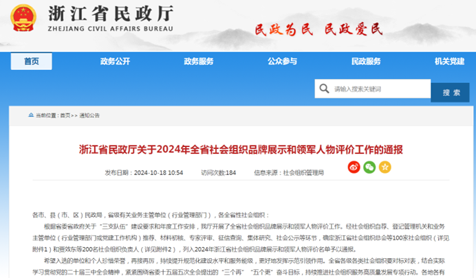 根據(jù)省委省政府關(guān)于“三支隊伍”建設(shè)要求和年度工作安排,浙江省民政廳開展了全省社會組織品牌展示和領(lǐng)軍人物評價工作。經(jīng)社會組織自薦、登記管理機關(guān)和業(yè)務(wù)主管單位(行業(yè)管理部門或黨建工作機構(gòu))推薦、材料初核、專家評審、征信查詢、集體研究、社會公示等環(huán)節(jié),最終確定100家社會組織和200名社會組織負(fù)責(zé)人,列入2024年浙江省社會組織品牌展示和領(lǐng)軍人物評價名單予以通報。