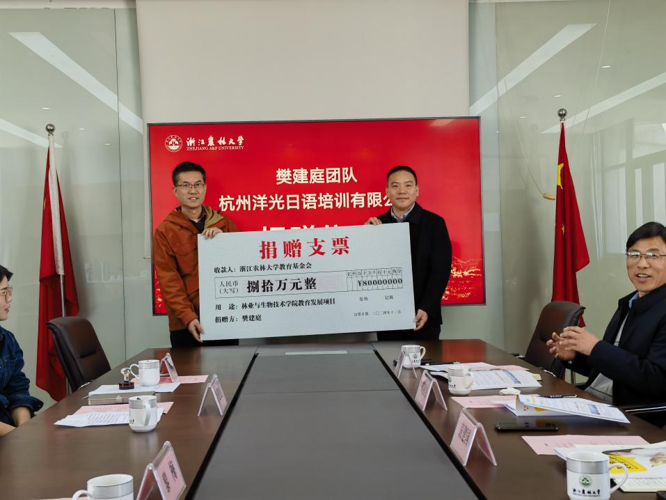 儀式上,捐贈人、林生院教師樊建庭介紹了在松材線蟲病防治方面開展的研究及取得的成效,并表示希望這次捐贈能夠成為一種示范,鼓勵更多的同事、校友乃至社會各界人士,以各種形式參與到學校的發展建設中來。杭州洋光日語培訓有限公司校長何輝林介紹了公司基本情況。