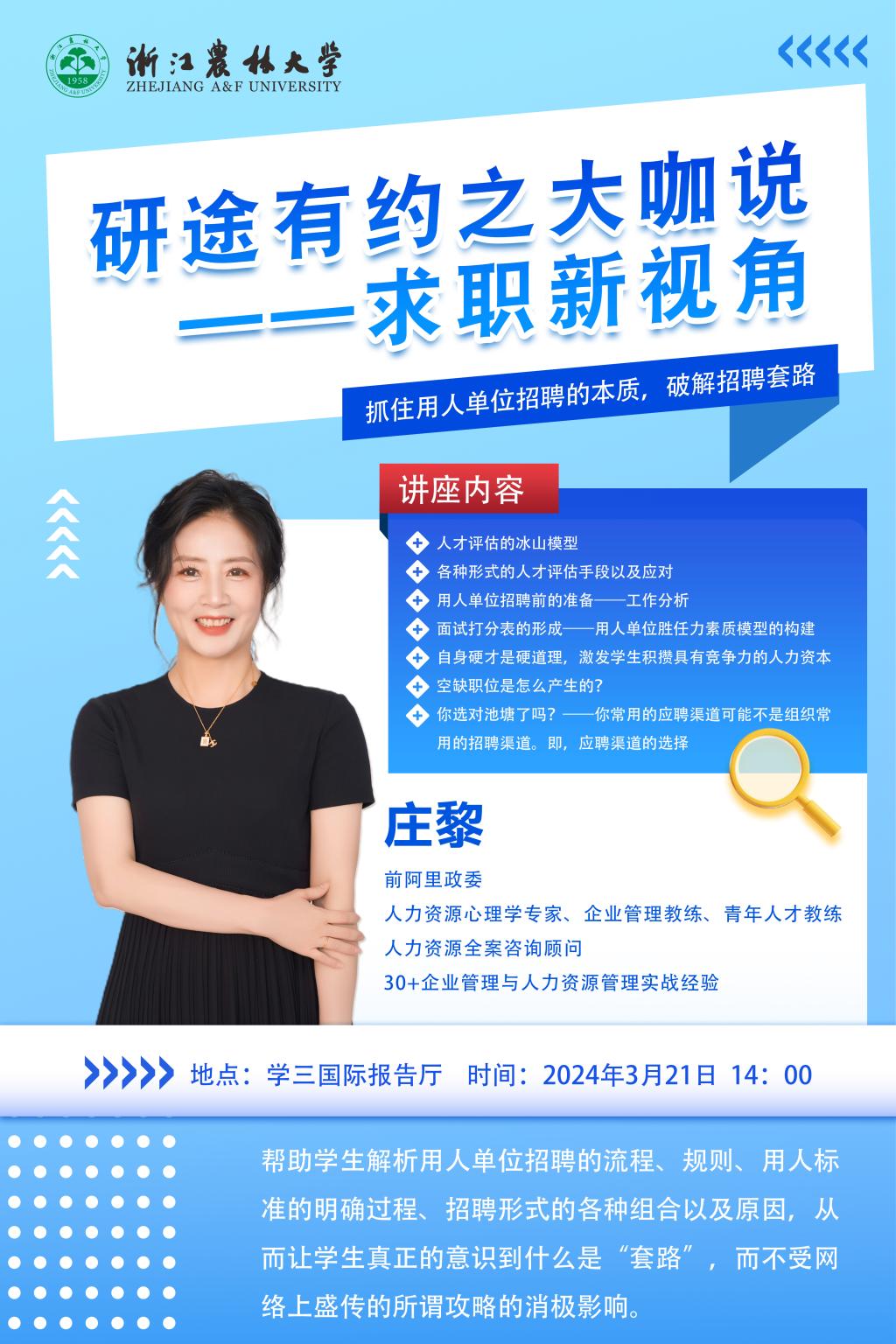為進一步加強研究生就業指導與服務,提升研究生就業競爭力,研工部特舉辦“研途有約”就業系列講座,現將“破解招聘套路”專題講座安排通知如下: