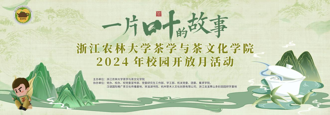 為深入踐行“三茶”統籌發展理念,認真落實《浙江省歷史經典產業高水平傳承高質量發展若干政策舉措》要求,弘揚“精行儉德”茶精神,呈現浙江農林大學茶學與茶文化學院“茶人才培養”“茶科學研究”“茶平臺建設”“茶文化傳播”的成果,特舉辦“一片葉的故事”浙江農林大學茶學與茶文化學院校園開放月活動。具體活動方案如下: