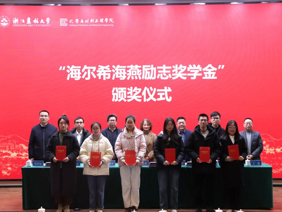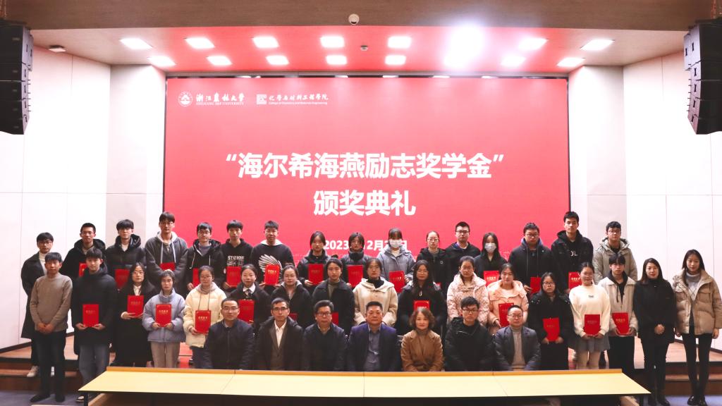 12月28日下午,化材學院舉辦第一屆“海爾希海燕勵志獎學金”頒獎典禮。杭州海爾希畜牧科技有限公司董事長樓偉杰、總經辦主任兼工會主席王毅、技術研發部經理王力,化材學院黨委書記謝志新及學院相關負責人出席活動,應用化學學科教師代表、2022級和2023級120余名學生參加活動。