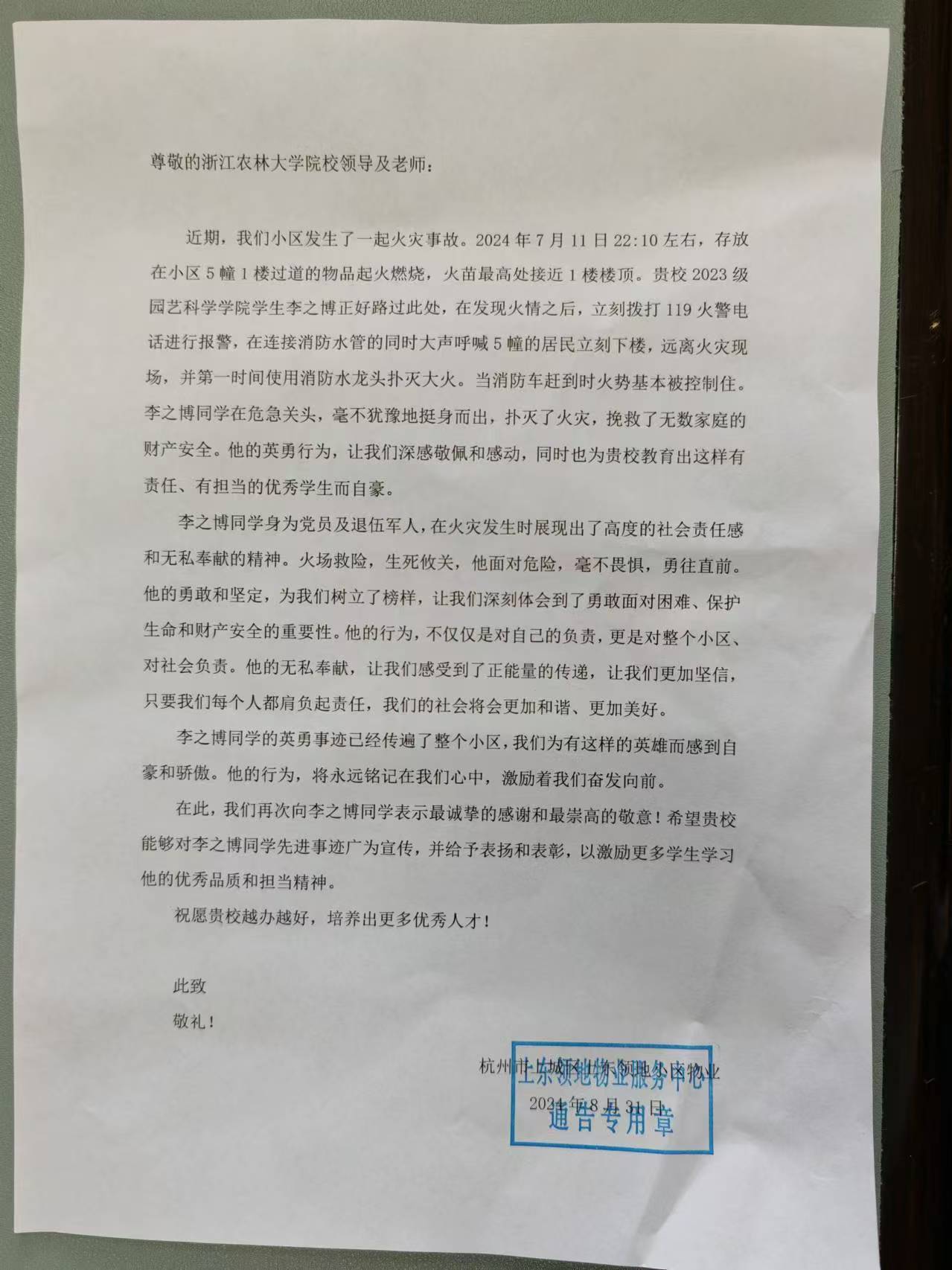 8月31日,一封來自杭州市上城區上東領地小區物業的感謝信寄到浙江農林大學,感謝我校園藝科學學院2023級學生李之博幫助小區火場救險,撲滅大火,保護了小區居民的人身安全和財產安全。