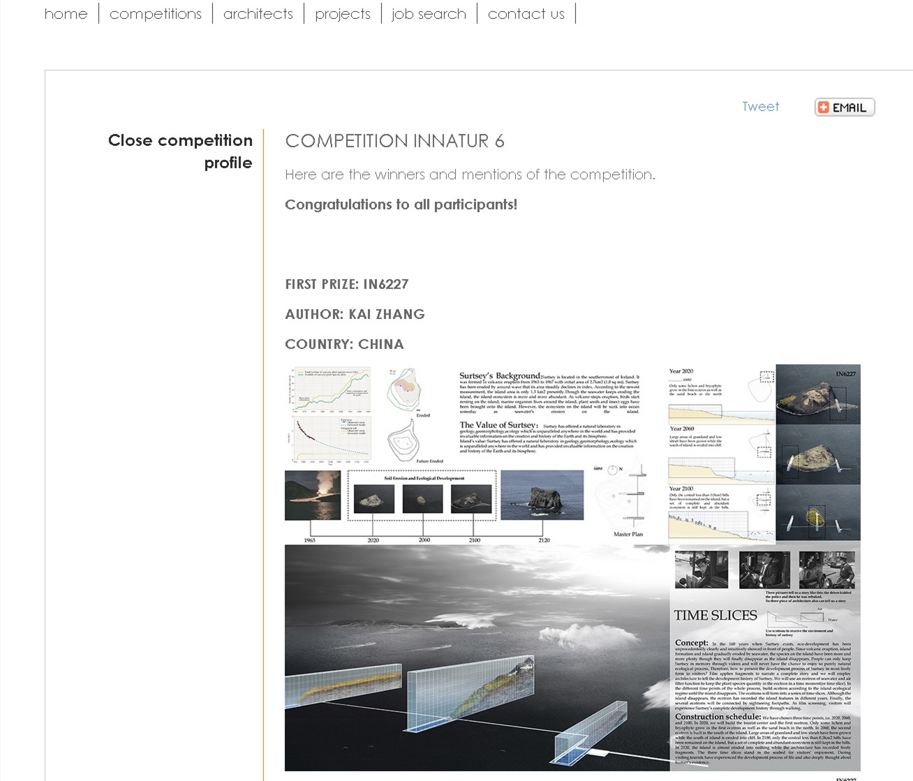 迄今為止,該競賽活動已成功舉辦六屆,此次競賽經過嚴格的三輪評選,來自中國、荷蘭、法國等國的七件作品入圍,最終組委會從中評選出前三名及四份提名獎作品。其中前三名被中國、荷蘭、法國的作品所斬獲。這也是中國學生再次在該競賽中取得唯一的一等獎獎項,去年由哈爾濱工業大學建筑學院的學生獲獎。