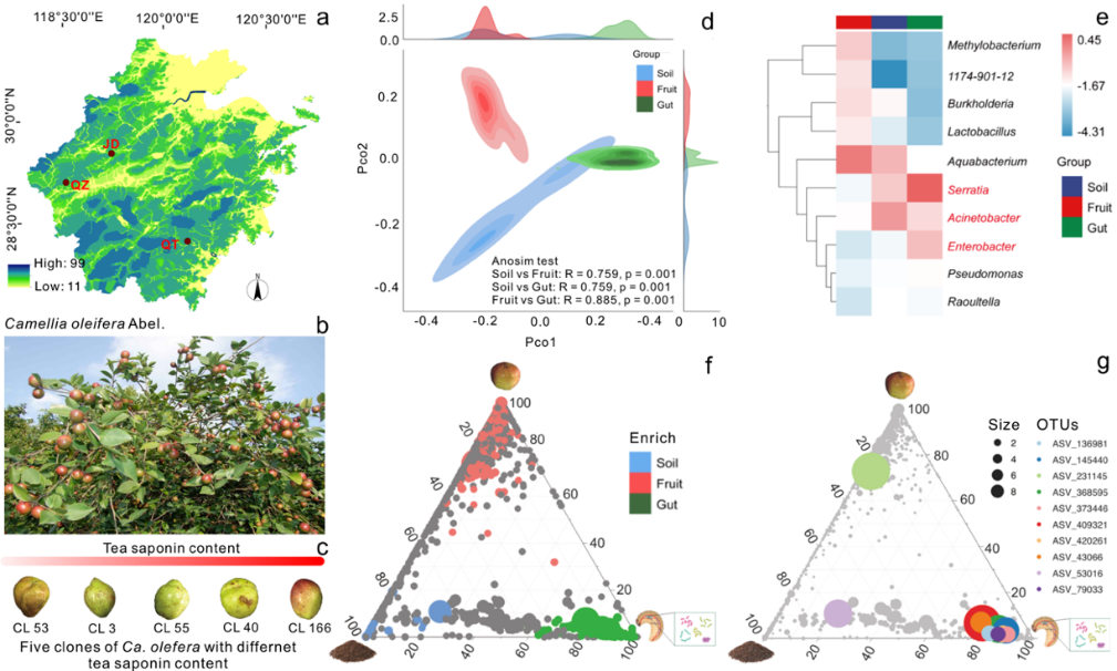 本研究的深入開展是建立在前期對茶籽象腸道菌群分析,及茶籽象爆發(fā)嚴(yán)重的老油茶土壤分析基礎(chǔ)上的。不同山茶屬植物與茶籽象腸道菌群結(jié)構(gòu)變化關(guān)聯(lián)度最大的植物次生代謝物為茶皂素(Tea saponin五環(huán)三萜類化合物)(張守科等,2020,mSystems);進(jìn)一步分析,茶籽象對不同無性系油茶的危害率與茶皂素含量負(fù)相關(guān),且油茶茶皂素是影響茶籽象存活率及腸道菌群多樣性的主要化合物,不動桿菌是高茶皂素含量寄主內(nèi)茶籽象腸道菌群優(yōu)勢菌群(張守科等,2021,林業(yè)科學(xué));與此同時(shí),對茶籽象爆發(fā)嚴(yán)重的老油茶林土壤微生物分析也發(fā)現(xiàn)不動桿菌是老油茶林土壤微生物的核心菌群(張守科等,2022,Microbiology Spectrum(IF=9.043),該研究結(jié)果受到Nature Food(IF=20.43)編輯的關(guān)注并撰寫“Camelliaplantations’ age impacts the soil microbiome”的Research Highlights報(bào)道)。基于此,我們提出了3個(gè)科學(xué)問題(1)茶籽象腸道菌群中核心菌群來源問題?(2)核心菌群是否具備降解茶皂素的能力?(3)回接目標(biāo)菌株后,茶籽象是否具備野生型一致的茶皂素耐受能力?相關(guān)科學(xué)問題的回答,幫助我們探討了植食性昆蟲腸道微生物溯源、參與植物次生代謝產(chǎn)物降解的菌群挖掘、開展功能基因的篩選以及菌株的傳遞與解毒功能驗(yàn)證等,為揭示腸道微生物介導(dǎo)植食性昆蟲耐受植物毒素的化學(xué)機(jī)制提供了直接證據(jù)。