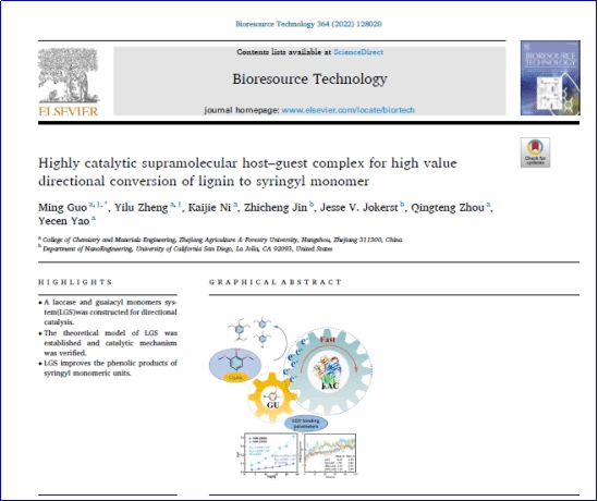 該研究部分實驗工作由本校2017級碩士研究生鄭軼璐在本校期間完成(鄭軼璐現(xiàn)為東華大學(xué)博士研究生),郭明教授研究團(tuán)隊歷經(jīng)五年解析闡釋了漆酶-介體系統(tǒng)(LMS)形成機(jī)制及對木質(zhì)素的轉(zhuǎn)化途徑。浙江農(nóng)林大學(xué)為第一單位和通訊作者單位。
