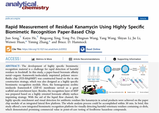 近日,食品與健康學院張宜明教授團隊在分析化學領域國際知名期刊Analytical Chemistry(《分析化學》)(ACS,中科院1區TOP,IF2021 = 8.008)發表題為“Rapid Measurement of Residual Kanamycin Using Highly Specific Biomimetic Recognition Paper-Based Chip”(《高特異性仿生識別紙基芯片快速測定卡那霉素殘留》)的論文,并成功入選當期Supplementary Cover Art(附件封面)。這是團隊指導本科生漏憶雯在Microchemical Journal(《微化學雜志》)上發表一作“Lateral flow analysis of Pb (II) in green tea integrated with ionic imprinted paper-based chip”(《離子印跡紙基芯片側流分析綠茶中的鉛Pb (II)》)之后紙基微流控研究方向更重要的一項階段性成果。