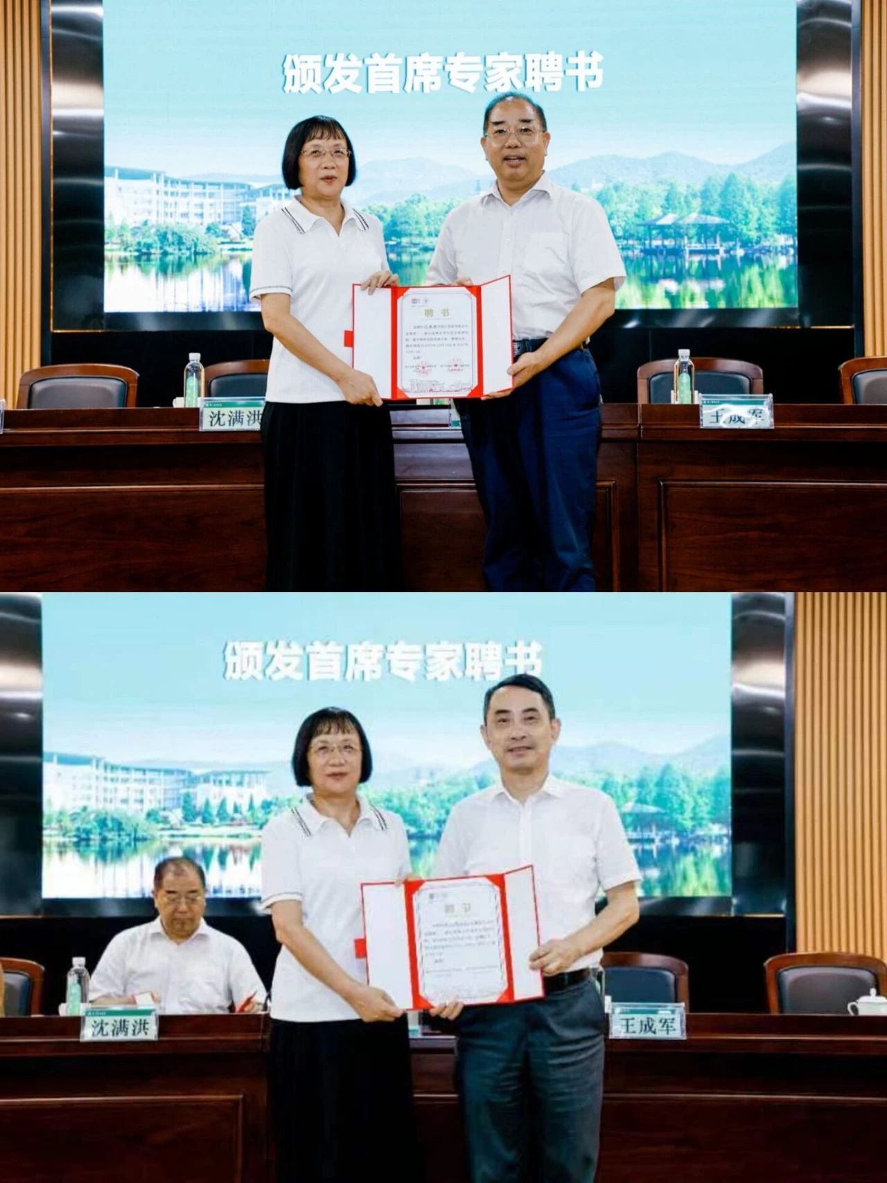 會議還為沈滿洪、孔凡斌頒發了首席專家聘書,為各研究所所長、副所長、辦公室主任、行政主管、部長、副部長頒發了聘書。