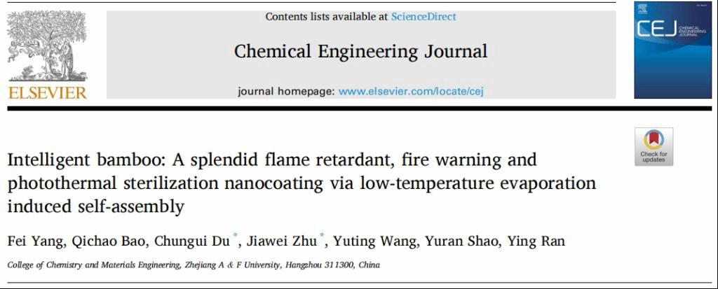 近日,化材學院生物質材料功能性改良與復合技術研究團隊在國際知名期刊《Chemical Engineering Journal》(中科院1區Top,IF=15.1)在線發表題為“Intelligent bamboo: A splendid flame retardant, fire warning and photothermal sterilization nanocoating via low-temperature evaporation induced self-assembly”的研究論文。化材學院林業工程學科杜春貴教授、青年教師朱家偉為通訊作者,在讀博士生楊菲為第一作者。