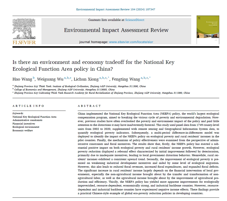 經濟管理學院吳偉光教授團隊撰寫的學術論文《Is there an environment and economy tradeoff for the National KeyEcological Function Area policy in China?》在SSCI期刊《Environmental Impact Assessment Review》發表,論文第一作者為2021級農業管理專業碩士生王浩,由吳偉光教授、王鳳婷副教授和熊立春副教授共同參與撰寫并指導,該期刊為中科院一區Top期刊,西安交通大學等認定的管理類國際知名期刊,期刊影響因子為6.122。