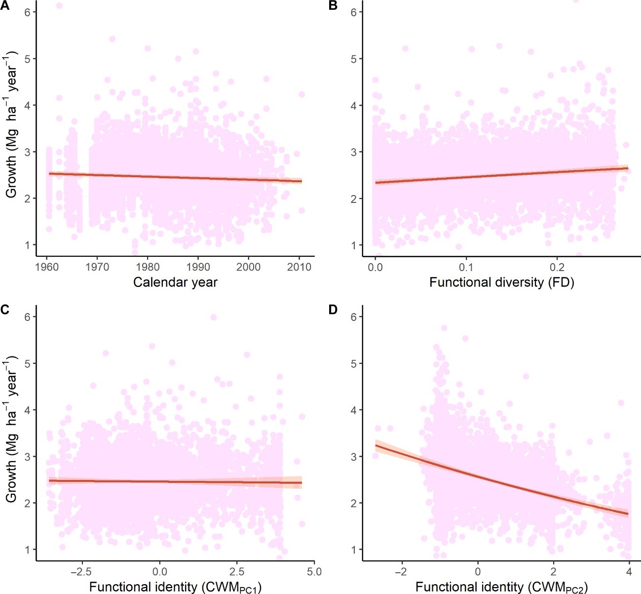 基于此,陳信力教授與多位國際學者合作,通過分析2491個森林樣地超過57年的數據,探討了樹木功能多樣性和功能性狀對森林生產力在面對環境變化時的影響。研究發現,盡管干旱地區森林生產力因水分下降的壓力而普遍下降,具有較高功能多樣性的森林卻能維持相對較高的生產力水平,而功能多樣性較低的森林生產力下降更顯著。此外,具有資源獲取型特征的森林可以從氣候變暖中受益,而具有耐旱特征的森林對干旱表現出更好的抵抗能力。該研究表明,促進森林的功能多樣性可以增強其對氣候變化的適應能力和韌性。通過了解樹木物種的功能性狀,森林管理策略可以優先選擇能夠耐受或從變化的環境條件中受益的物種,這對于促進森林生態系統應付氣候變化的長期可持續性至關重要。