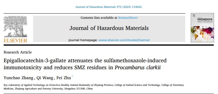5月15日,動物科技學院·動物醫學院朱斐教授團隊在環境科學領域國際頂尖期刊Journal of Hazardous Materials (中科院1區Top,IF=13.6)在線發表題為《兒茶酚胺降低克氏原螯蝦體內磺胺甲惡唑殘留及其引起的免疫毒性》(Epigallocatechin-3-gallate attenuates the sulfamethoxazole-induced immunotoxicity and reduces SMZ residues inProcambarus clarkii) 的論文。第一作者為該團隊的碩士研究生張韻超,通訊作者為朱斐教授。