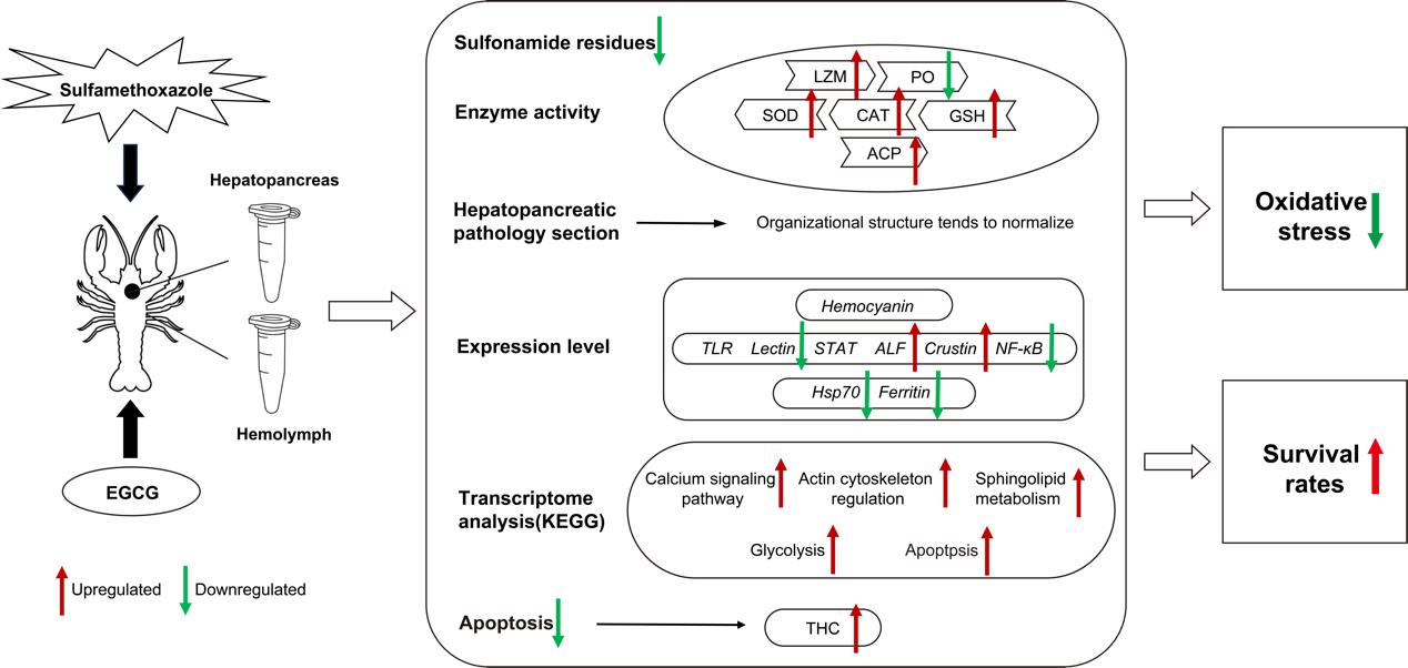 該研究揭示了EGCG(兒茶酚胺)在降低克氏原螯蝦體內磺胺甲惡唑(SMZ)殘留及其引起的免疫毒性的作用機制。EGCG提高了與抗菌和抗氧化相關的酶的活性,有效降低了SMZ暴露引起的氧化損傷,同時提高了抗菌免疫力。EGCG降低了SMZ暴露引起的細胞凋亡率,增加了血細胞數,同時促進了肝胰腺組織損傷的恢復。通過轉錄組分析,EGCG顯著影響了多條與細胞和代謝相關的信號通路,為后續研究提供了思路。磺胺甲惡唑是水產養殖中常用的抗生素,其在水體中的殘留對水生動物構成了巨大威脅。本研究首次證實EGCG可以減輕SMZ誘導的水生動物免疫毒性,并減少暴露于SMZ的水生動物體內的SMZ殘留。該研究結果對于降低抗生素殘留及其對水生動物的免疫毒性具有重要的科學意義,同時具有應用于養殖生產中的潛力。