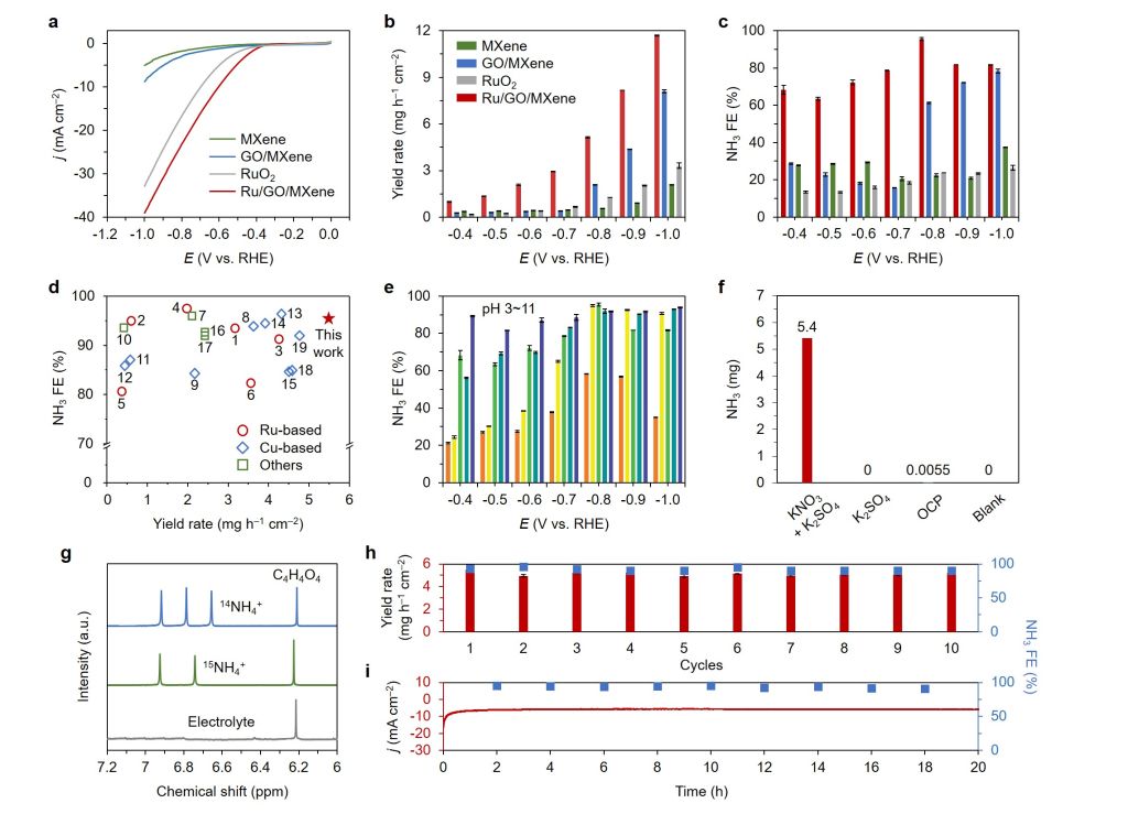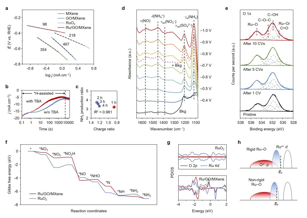 研究制備的Ru/GO/MXene在?0.8 V vs. RHE時(shí)表現(xiàn)出卓越的NH3產(chǎn)率,超過(guò)5 mg h?1 cm?2,實(shí)現(xiàn)幾乎100%的NH3?法拉第效率,遠(yuǎn)遠(yuǎn)超過(guò)大多數(shù)報(bào)道的釕基催化劑材料。XPS和ATR-FTIR證實(shí)Ru/GO/MXene中的Ru?O共價(jià)鍵具有動(dòng)態(tài)和自修復(fù)特性,這在促進(jìn)硝酸根轉(zhuǎn)化為氨的催化過(guò)程中起著關(guān)鍵作用。之后的理論研究進(jìn)一步揭示了Ru?O鍵的非剛性以及它們?nèi)绾巫晕艺{(diào)節(jié)以適應(yīng)硝酸還原反應(yīng)中涉及的各種中間體。這項(xiàng)工作提供了一種制造具有可逆和非剛性金屬?氧鍵的高性能電催化劑的方法,為實(shí)際廢水中的硝酸根電解開辟了新的可能性。