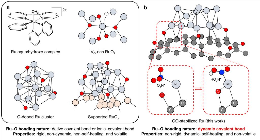 該團(tuán)隊(duì)設(shè)計(jì)了一種介于氧化石墨烯(GO)和支撐過(guò)渡金屬(TM)之間的非剛性金屬?氧鍵。其中納米尺度的釕(Ru)分散在GO上,另一個(gè)二維材料MXene用于補(bǔ)償GO的低電導(dǎo)率。GO片作為“微米級(jí)”配體通過(guò)氧化基團(tuán)(主要是環(huán)氧和羥基)與TM結(jié)合。當(dāng)過(guò)渡金屬納米顆粒沉積到石墨烯氧化物上時(shí),便可形成非剛性TM–O鍵,牢固地限制在TM/石墨烯氧化物界面上。含氧基團(tuán)能夠根據(jù)反應(yīng)動(dòng)態(tài)與過(guò)渡金屬發(fā)生關(guān)聯(lián)和解離,與游離氧和羥基配體的不可逆遷移形成對(duì)比。