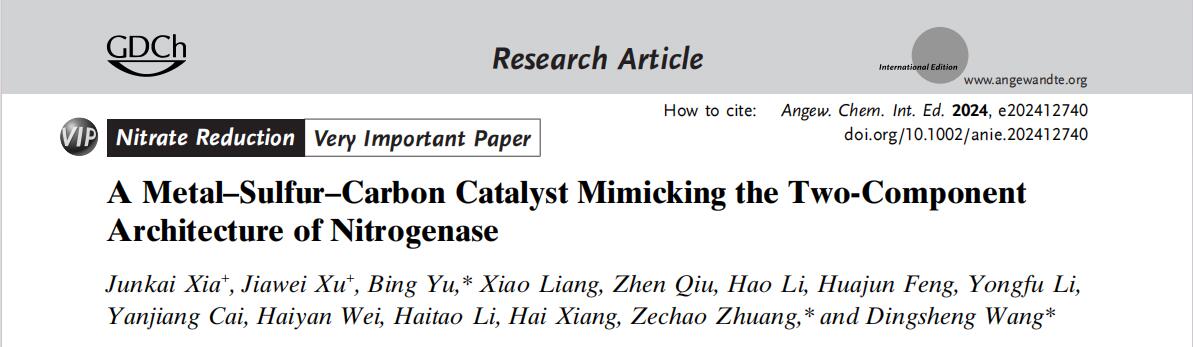 近日,環資院、碳中和學院余兵教授領銜的環境功能材料團隊在國際頂尖期刊《Angewandte Chemie》(中科院1區Top,IF=16.8)在線發表題為《模擬氮酶雙組分結構的金屬-硫-碳催化劑》(A Metal–Sulfur–Carbon Catalyst Mimicking the Two-Component Architecture of Nitrogenase)的研究論文。浙江農林大學為該論文第一單位和通訊作者單位。該團隊2021級碩士研究生夏浚凱為第一作者,環資院、碳中和學院余兵教授為該論文的通訊作者。
