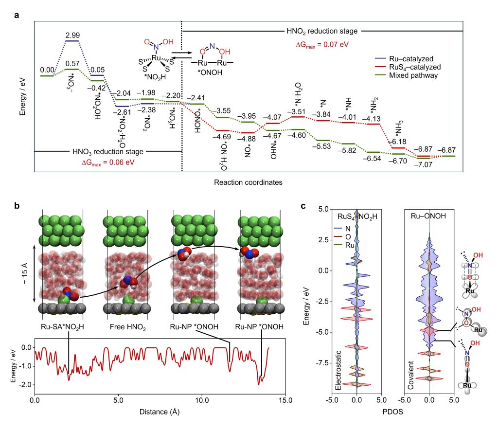 該團隊設計了一種由兩種酶的結構酶學啟發的雙組分M-S-C催化劑,并通過表征和機制探究實驗進一步探索了其結構依賴性,以通過電化學硝酸還原(NitRR)合成氨。我們觀察到,只有當Ru SAs和NPs共存時,催化劑才能達到最高性能。這種(SAs + NPs)/S-C表現出顯著的NH3產率約為~37 mg L-1h-1和法拉第效率約為~97%,持續超過200小時,并且超過了大多數報道的電催化劑。實驗和理論研究揭示了Ru SAs與S配位在促進HONO中間體的形成和隨后在相鄰Ru NPs上的還原反應中的關鍵作用。因此,S-C負載的NPs與SAs之間的協同作用與雙組分氮化酶催化作用表現出顯著的相似性。這項工作擴展了SACs的構型空間的限制,并有助于氨合成催化劑的合理設計。