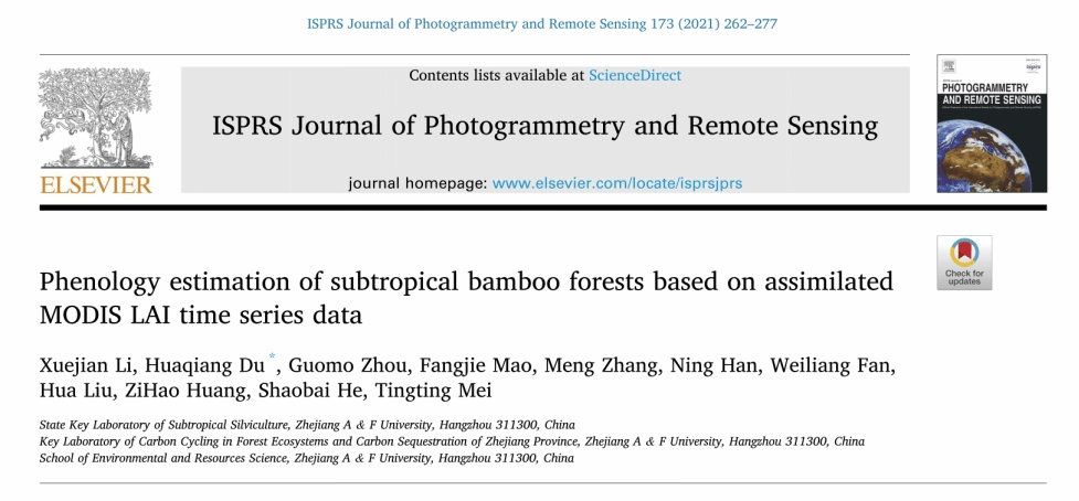 該研究是國家重點實驗室周國模教授團隊繼2017年在該刊發表題為“Assimilating leaf area index of three typical types of subtropical forest inChina from MODIS time series data based on the integrated ensemble Kalman ?lter and PROSAIL model”后的又一項創新工作。國家重點實驗室為第一單位和通訊作者單位,李雪建博士為第一作者、杜華強教授為通訊作者。研究得到了國家自然科學基金、省科技廳重點研發計劃、國家重點實驗室自主研究課題等項目資助。